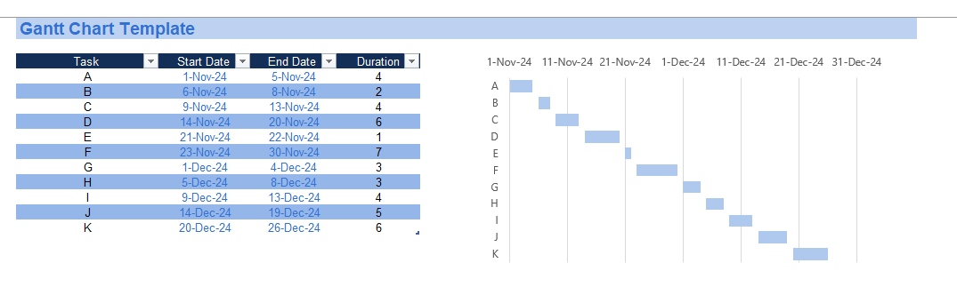 - Visual Representation of Tasks: The Gantt Chart Template provides a visual representation of project tasks, making it easier to understand the project's progress. The template uses Gantt bars to display the start and end dates of each task, along with its duration. This allows project managers to quickly identify any delays or bottlenecks and make necessary adjustments to keep the project on track.
